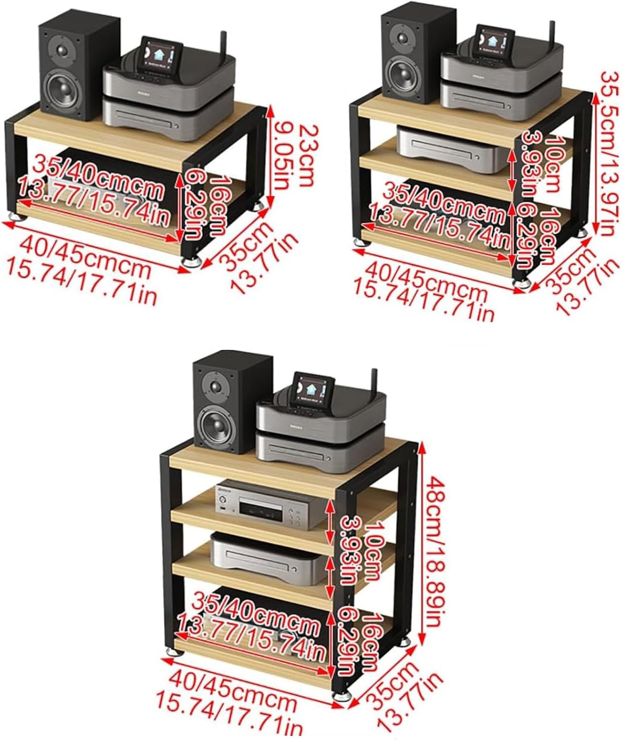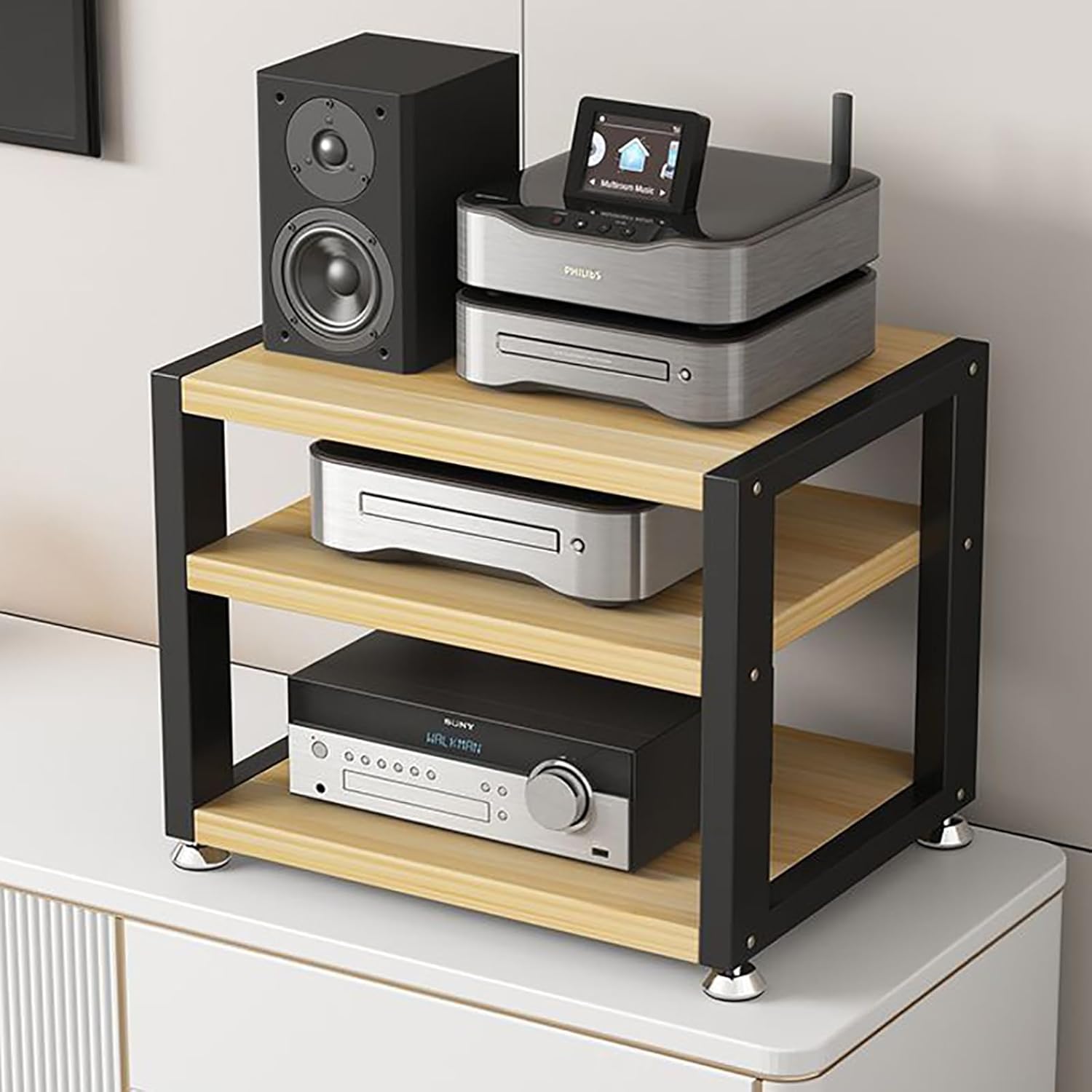 "Movable AV Media Stand with Wooden Shelf - 3-Tier Desktop Video Audio Rack